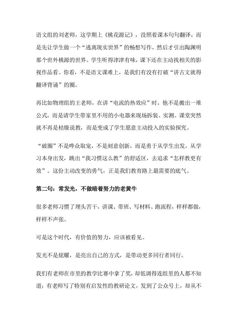 期末教师大会,校长讲话:“敢破圈、常发光、真热爱”——这场期末演讲刷爆教育圈,催泪无数老师! 09-29 发言稿 1.17k ——预览已结束,还剩2页未读——开通会员后可免费下载高清完整文档 资源下载此资源下载价格为15米,VIP免费,请先登录 资源下载下载价格15 米VIP免费请先登录 0 0