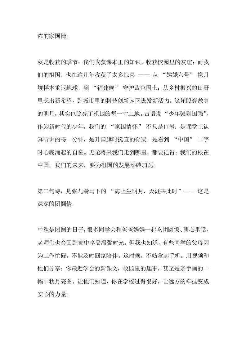中秋国庆双节,校长在国旗下讲话:双节同辉映校园,家国同心向未来 10-04 国旗下讲话 1.13k ——预览已结束,还剩2页未读——开通会员后可免费下载高清完整文档 资源下载此资源下载价格为15米,VIP免费,请先登录 资源下载下载价格15 米VIP免费请先登录 0 0