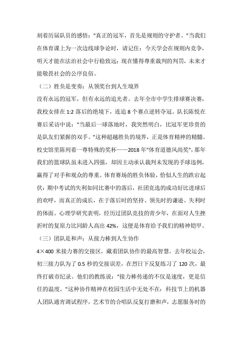 校长在国旗下讲话:跑道与人生的交响——体育精神的成长启示 10-26 国旗下讲话 1.07k ——预览已结束,还剩6页未读——开通会员后可免费下载高清完整文档 资源下载此资源下载价格为15米,VIP免费,请先登录 资源下载下载价格15 米VIP免费请先登录 0 0