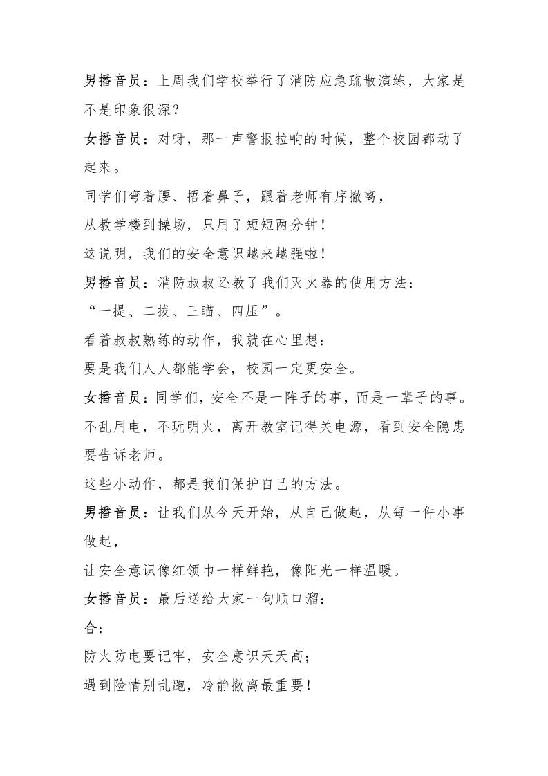“11·9全国消防日”红领巾广播稿——红领巾学消防,平安伴我成长 11-11 发言稿 959 ——预览已结束,还剩1页未读——开通会员后可免费下载高清完整文档 资源下载此资源下载价格为15米,VIP免费,请先登录 资源下载下载价格15 米VIP免费请先登录 0 0