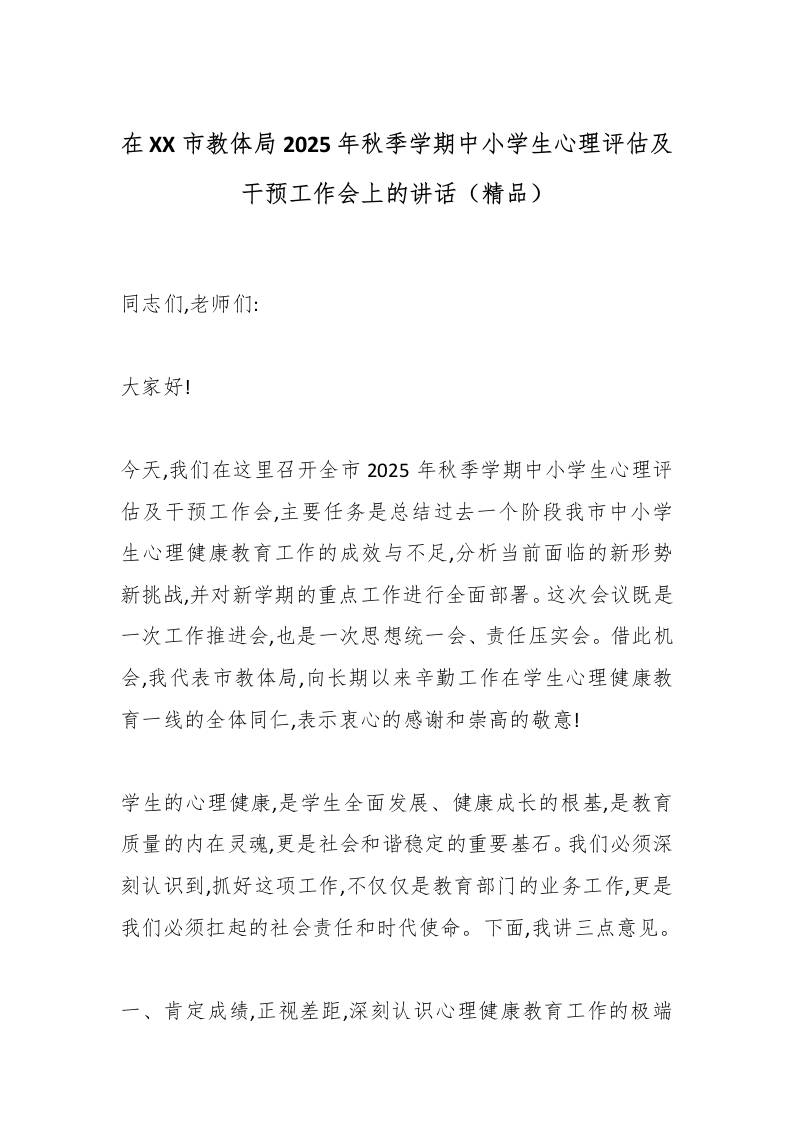 在XX市教体局2025年秋季学期中小学生心理评估及干预工作会上的讲话(精品) 11-16 发言稿 858 ——预览已结束,还剩9页未读——开通会员后可免费下载高清完整文档 资源下载此资源下载价格为15米,VIP免费,请先登录 资源下载下载价格15 米VIP免费请先登录 0 0