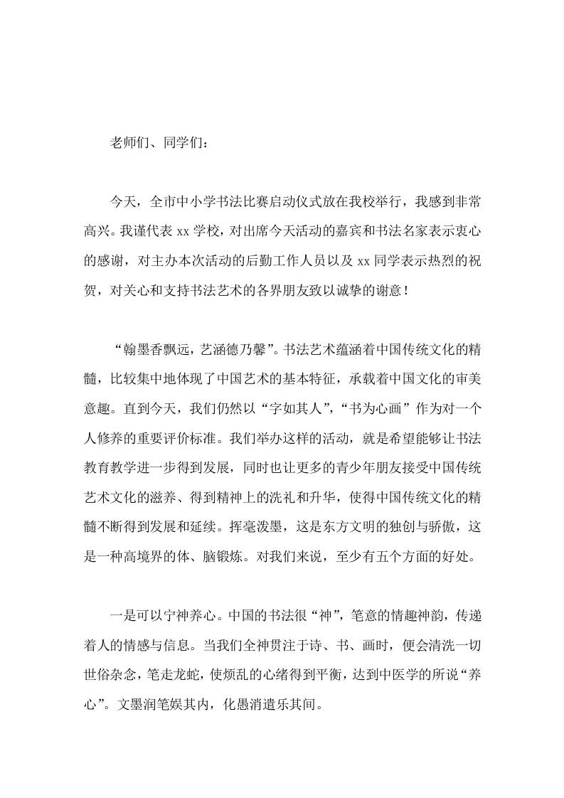 中小学书法比赛启动仪式上,校长讲话挥毫泼墨,这是东方文明的独创与骄傲,这是一种高境界的体、脑锻炼 11-17 发言稿 971 ——预览已结束,还剩1页未读——开通会员后可免费下载高清完整文档 资源下载此资源下载价格为15米,VIP免费,请先登录 资源下载下载价格15 米VIP免费请先登录 0 0