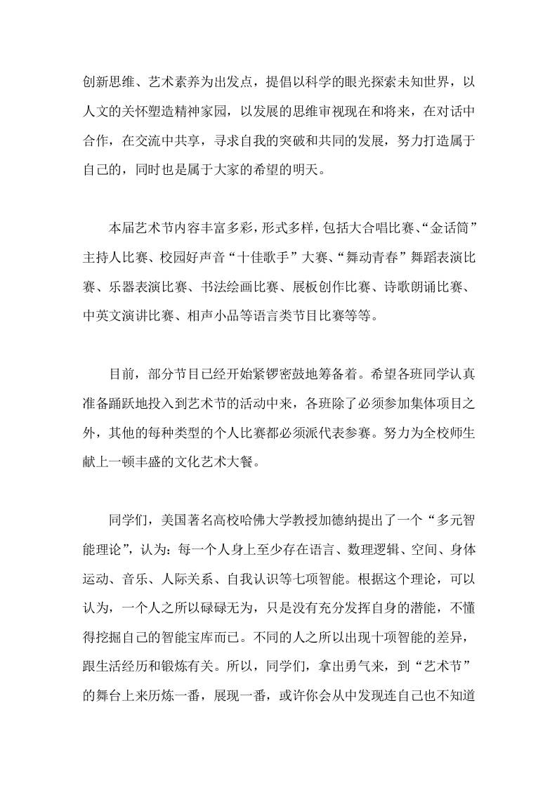校园文化艺术节,校长在国旗下讲话祝我校的校园文化艺术节能办得一年更比一年好,一届更比一届高 11-26 国旗下讲话 524 ——预览已结束,还剩1页未读——开通会员后可免费下载高清完整文档 资源下载此资源下载价格为15米,VIP免费,请先登录 资源下载下载价格15 米VIP免费请先登录 0 0