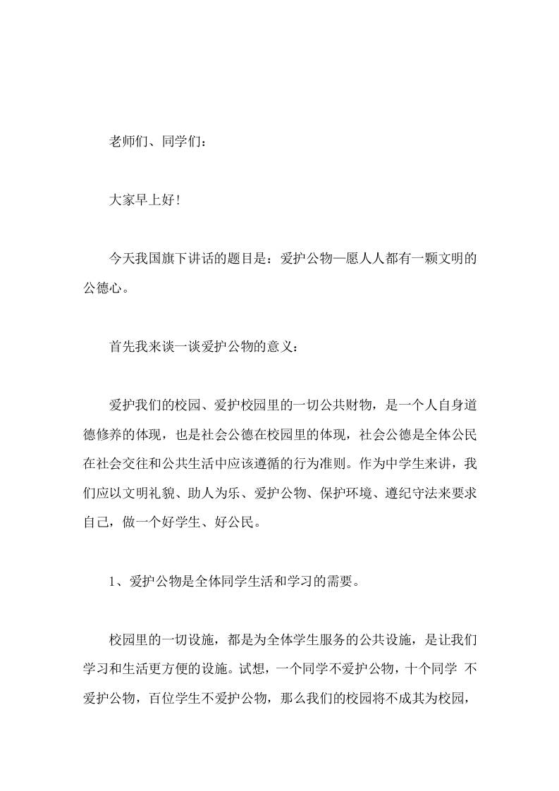 校长在国旗下讲话爱护公物,愿人人都有一颗文明的公德心 11-26 国旗下讲话 842 ——预览已结束,还剩1页未读——开通会员后可免费下载高清完整文档 资源下载此资源下载价格为15米,VIP免费,请先登录 资源下载下载价格15 米VIP免费请先登录 0 0