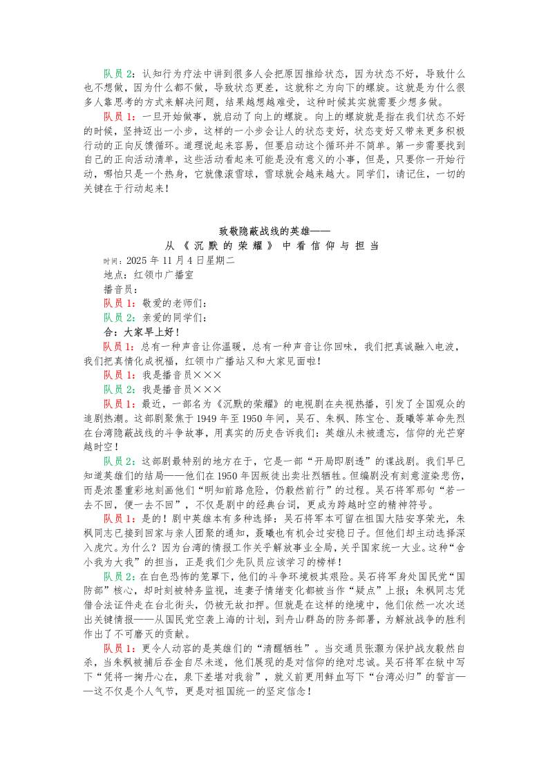 红领巾广播站2025年秋季学期第10周播稿 11-29 发言稿 503 ——预览已结束,还剩4页未读——开通会员后可免费下载高清完整文档 资源下载此资源下载价格为15米,VIP免费,请先登录 资源下载下载价格15 米VIP免费请先登录 0 0