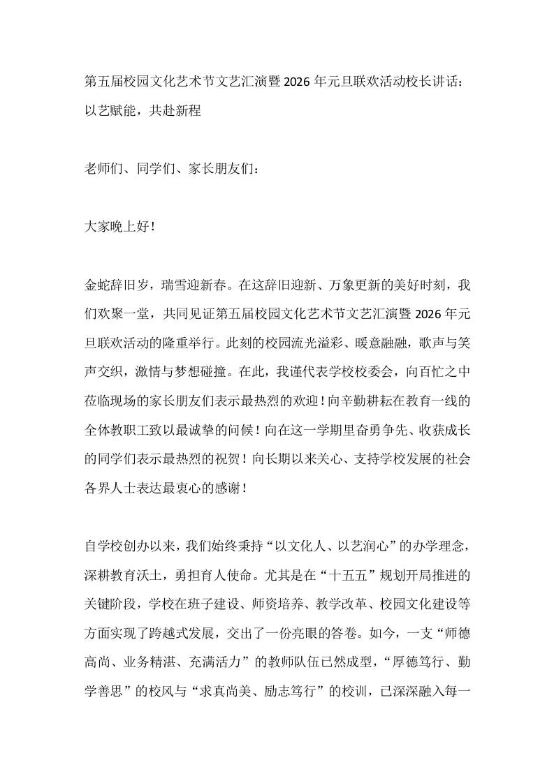 第五届校园文化艺术节文艺汇演暨2026年元旦联欢活动校长讲话:以艺赋能,共赴新程 01-08 发言稿 580 ——预览已结束,还剩2页未读——开通会员后可免费下载高清完整文档 资源下载此资源下载价格为15米,VIP免费,请先登录 资源下载下载价格15 米VIP免费请先登录 0 0