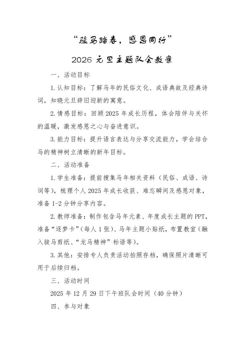 2026元旦主题队会教案:骏马踏春,感恩同行 01-11 发言稿 540 ——预览已结束,还剩2页未读——开通会员后可免费下载高清完整文档 资源下载此资源下载价格为15米,VIP免费,请先登录 资源下载下载价格15 米VIP免费请先登录 0 0