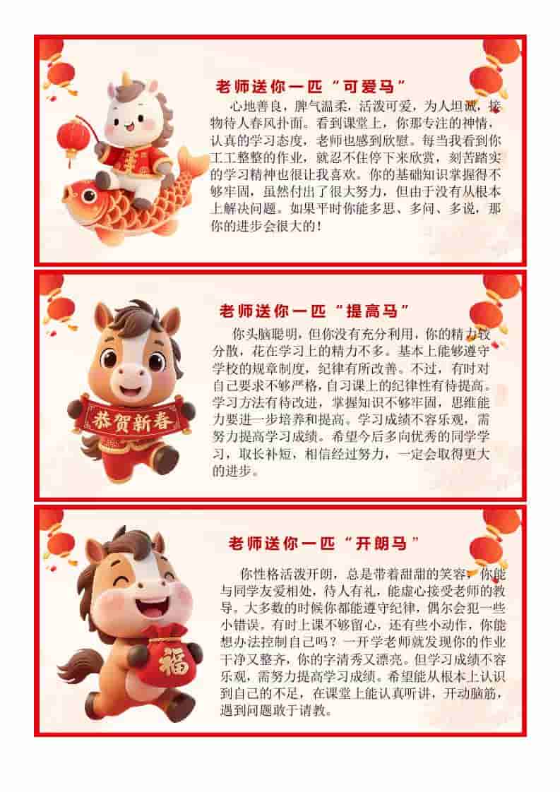 2026马年卡通特色期末评语(45条) 4周前 评语 1.07k ——预览已结束,还剩13页未读——开通会员后可免费下载高清完整文档 资源下载此资源下载价格为15米,VIP免费,请先登录 资源下载下载价格15 米VIP免费请先登录 0 0