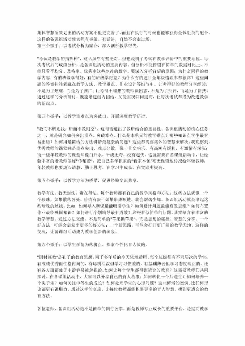 在全校教研组长、备课组长会上,校长讲话:真正提高质量和效益的6个有效抓手! 3周前 发言稿 986 ——预览已结束,还剩1页未读——开通会员后可免费下载高清完整文档 资源下载此资源下载价格为15米,VIP免费,请先登录 资源下载下载价格15 米VIP免费请先登录 0 0