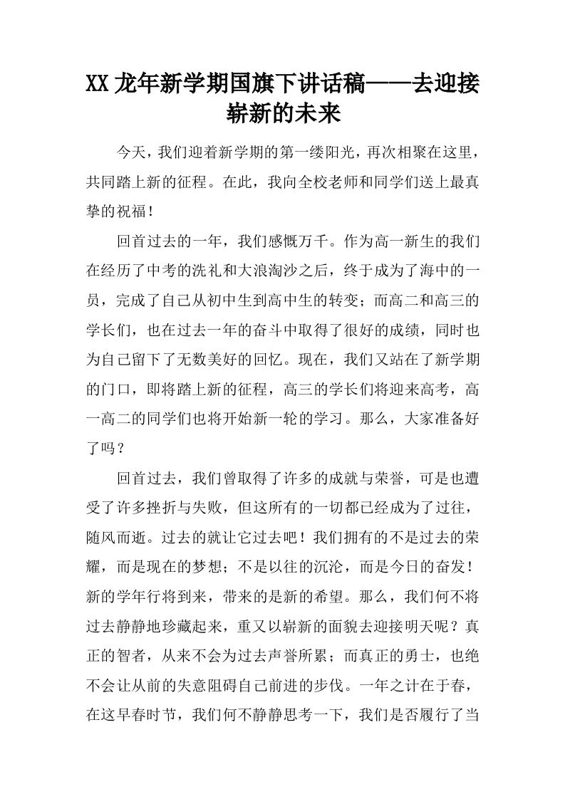 XX龙年新学期国旗下讲话稿——去迎接崭新的未来[推荐] 12-18 国旗下讲话 11 ——预览已结束,还剩1页未读——开通会员后可免费下载高清完整文档 资源下载此资源下载价格为15米,VIP免费,请先登录 资源下载下载价格15 米VIP免费请先登录 0 0