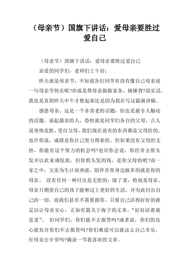 (母亲节)国旗下讲话:爱母亲要胜过爱自己[推荐] 12-18 国旗下讲话 11 ——预览已结束,还剩2页未读——开通会员后可免费下载高清完整文档 资源下载此资源下载价格为15米,VIP免费,请先登录 资源下载下载价格15 米VIP免费请先登录 0 0