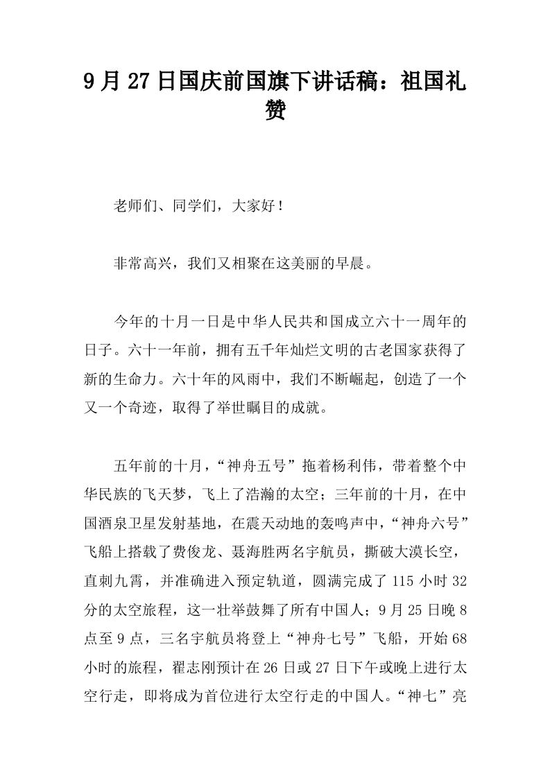 9月27日国庆前国旗下讲话稿:祖国礼赞[推荐] 12-20 国旗下讲话 14 ——预览已结束,还剩1页未读——开通会员后可免费下载高清完整文档 资源下载此资源下载价格为15米,VIP免费,请先登录 资源下载下载价格15 米VIP免费请先登录 0 0