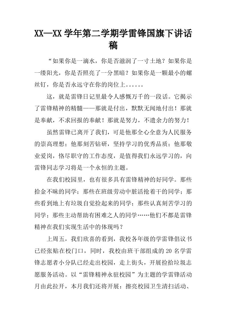 XX—XX学年第二学期学雷锋国旗下讲话稿[推荐] 12-21 国旗下讲话 11 ——预览已结束,还剩1页未读——开通会员后可免费下载高清完整文档 资源下载此资源下载价格为15米,VIP免费,请先登录 资源下载下载价格15 米VIP免费请先登录 0 0
