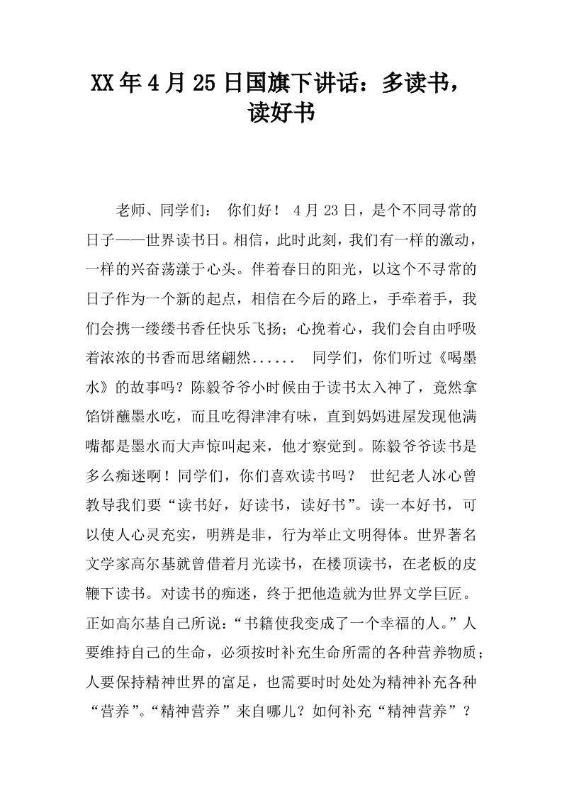 XX年4月25日国旗下讲话:多读书,读好书[推荐] 12-21 国旗下讲话 11 ——预览已结束,还剩1页未读——开通会员后可免费下载高清完整文档 资源下载此资源下载价格为15米,VIP免费,请先登录 资源下载下载价格15 米VIP免费请先登录 0 0