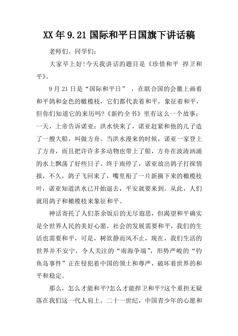 XX年9.21国际和平日国旗下讲话稿[推荐] 12-21 国旗下讲话 9 ——预览已结束,还剩1页未读——开通会员后可免费下载高清完整文档 资源下载此资源下载价格为15米,VIP免费,请先登录 资源下载下载价格15 米VIP免费请先登录 0 0
