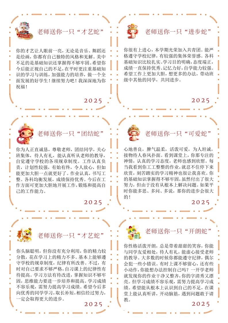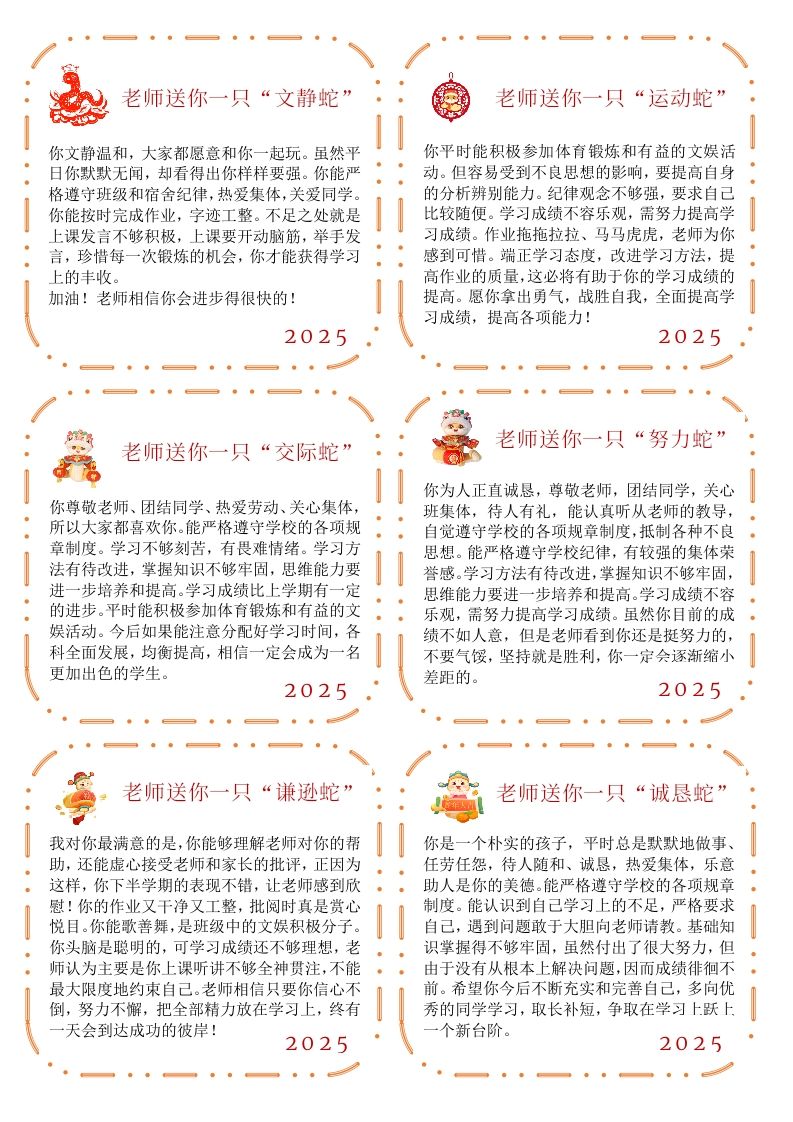 【蛇年】卡通特色评语-每页面6条(54条) 01-03 评语 12 ——预览已结束,还剩7页未读——开通会员后可免费下载高清完整文档 资源下载此资源下载价格为15米,VIP免费,请先登录 资源下载下载价格15 米VIP免费请先登录 0 0