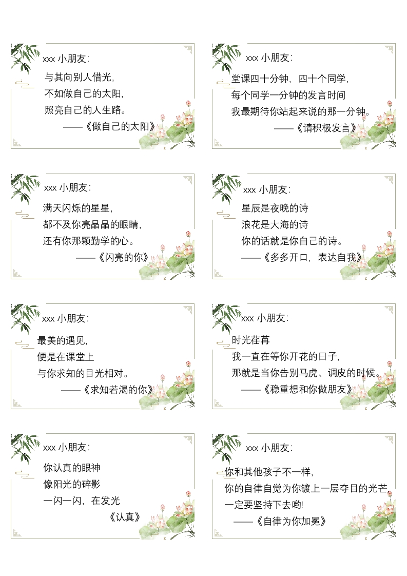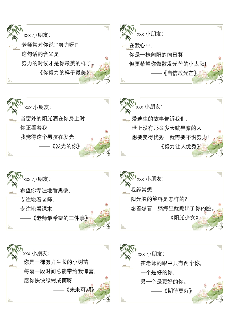04-64则《老师送你三行诗》低年级评语(长9.5宽5.5cm) 01-06 评语 13 ——预览已结束,还剩6页未读——开通会员后可免费下载高清完整文档 资源下载此资源下载价格为15米,VIP免费,请先登录 资源下载下载价格15 米VIP免费请先登录 0 0