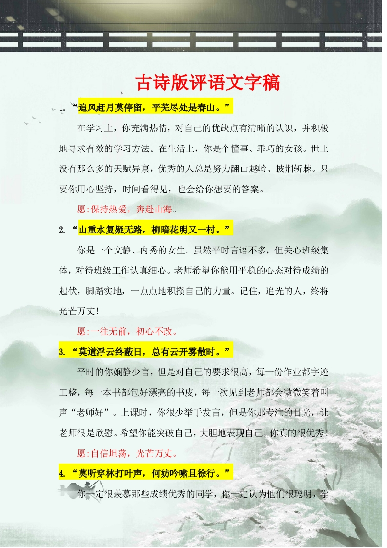 古风评语文字评语 01-08 评语 11 ——预览已结束,还剩15页未读——开通会员后可免费下载高清完整文档 资源下载此资源下载价格为15米,VIP免费,请先登录 资源下载下载价格15 米VIP免费请先登录 0 0