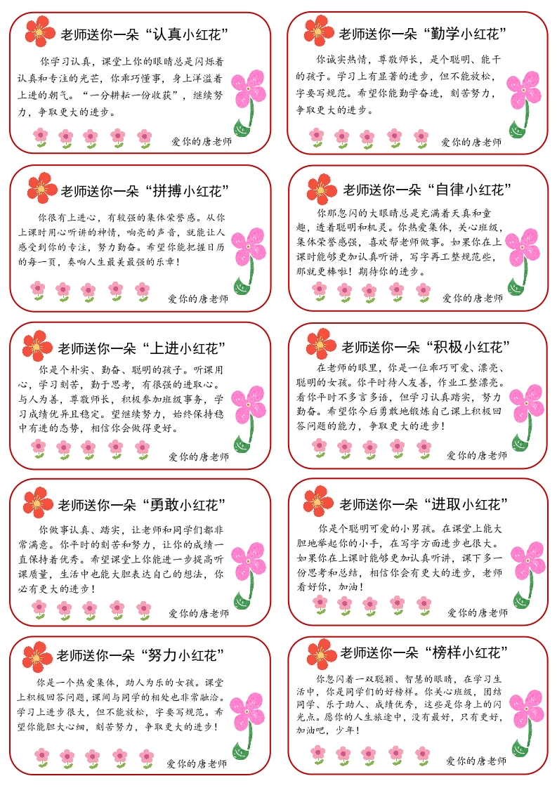 01.送你一朵小红花60则创意期末评语(每页10则) 01-08 评语 11 ——预览已结束,还剩4页未读——开通会员后可免费下载高清完整文档 资源下载此资源下载价格为15米,VIP免费,请先登录 资源下载下载价格15 米VIP免费请先登录 0 0