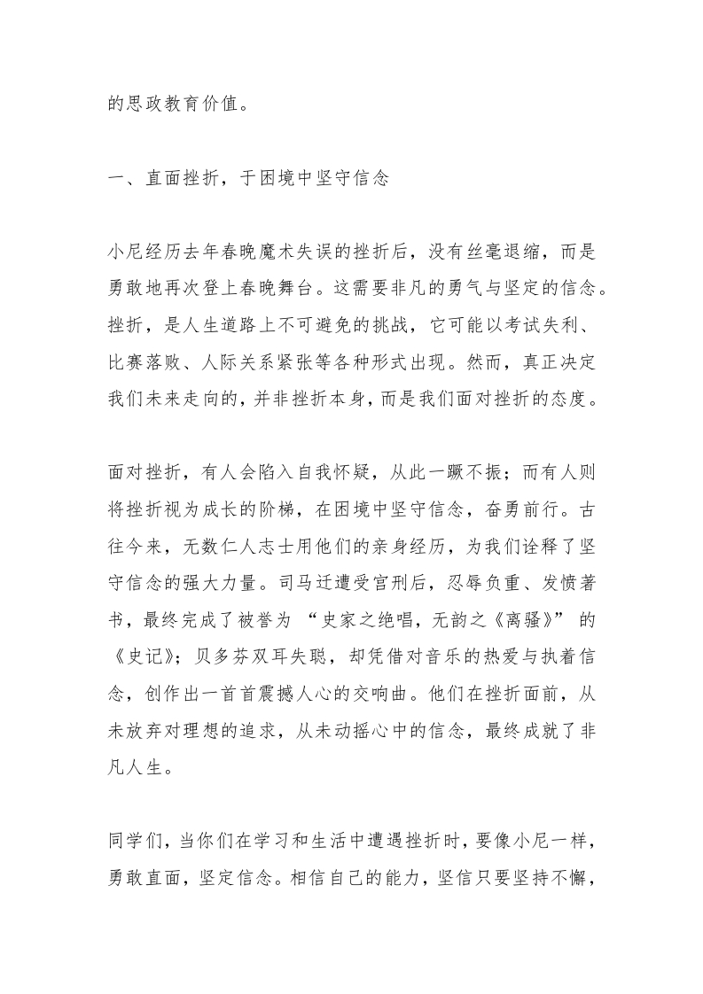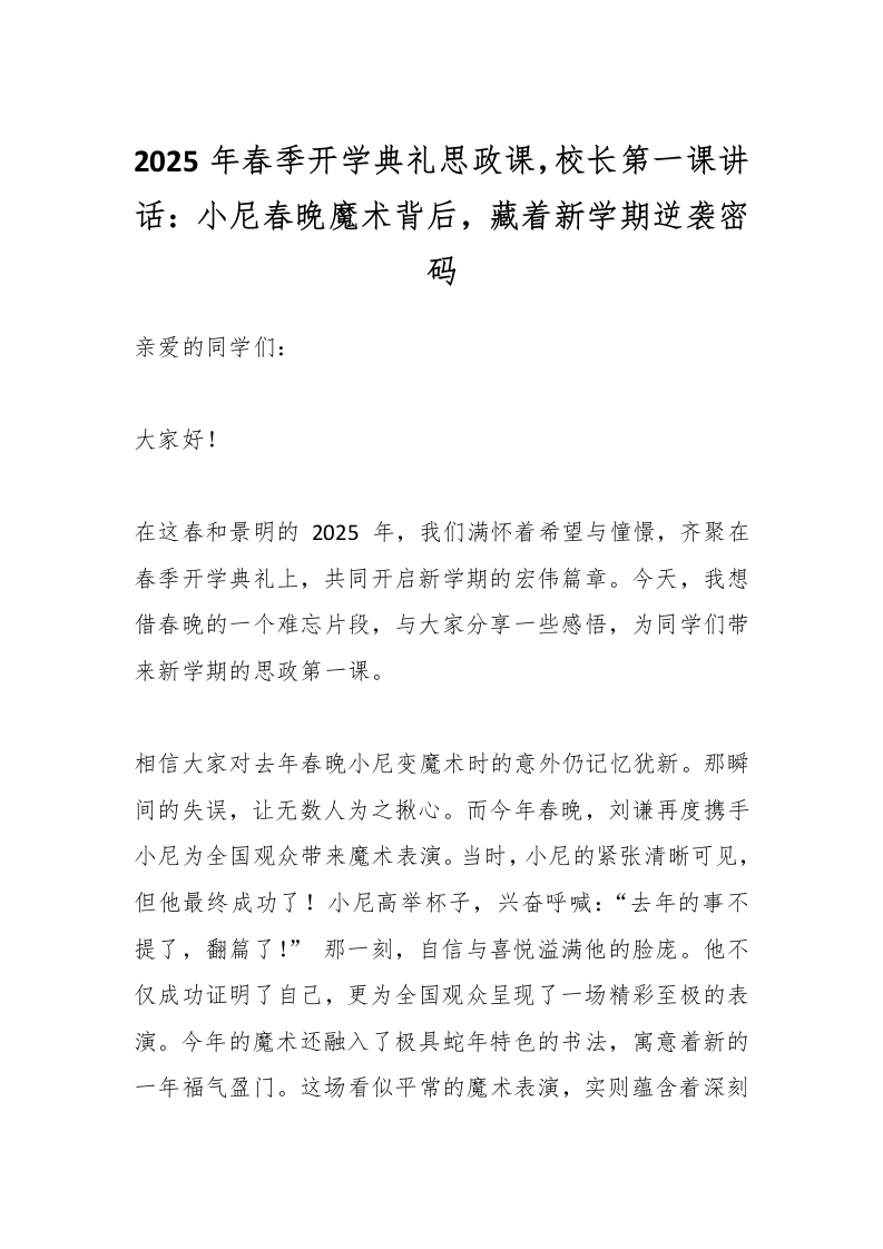 2025年春季开学典礼思政课,校长第一课讲话:小尼春晚魔术背后,藏着新学期逆袭密码 02-09 发言稿 11 ——预览已结束,还剩3页未读——开通会员后可免费下载高清完整文档 资源下载此资源下载价格为15米,VIP免费,请先登录 资源下载下载价格15 米VIP免费请先登录 0 0