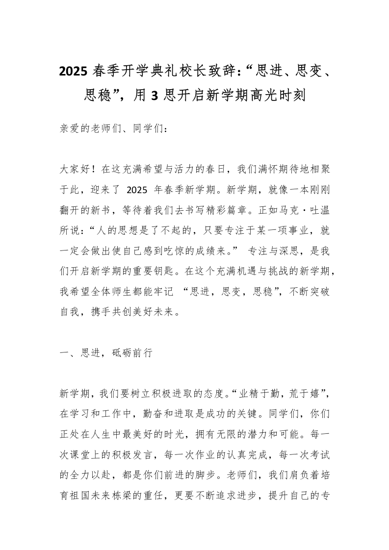 2025春季开学典礼校长致辞:“思进、思变、思稳”,用3思开启新学期高光时刻 02-09 发言稿 11 ——预览已结束,还剩2页未读——开通会员后可免费下载高清完整文档 资源下载此资源下载价格为15米,VIP免费,请先登录 资源下载下载价格15 米VIP免费请先登录 0 0