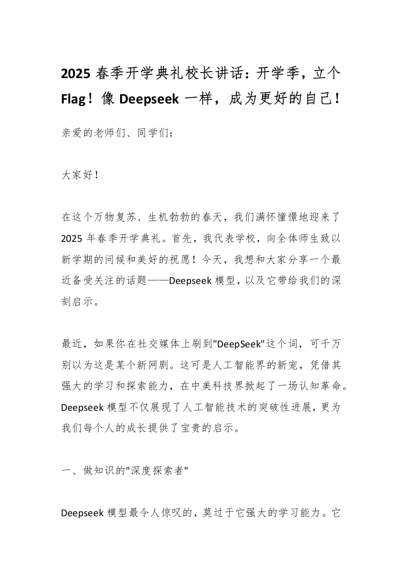 2025春季开学典礼校长讲话:开学季,立个Flag!像Deepseek一样,成为更好的自己! 02-09 发言稿 11 ——预览已结束,还剩3页未读——开通会员后可免费下载高清完整文档 资源下载此资源下载价格为15米,VIP免费,请先登录 资源下载下载价格15 米VIP免费请先登录 0 0