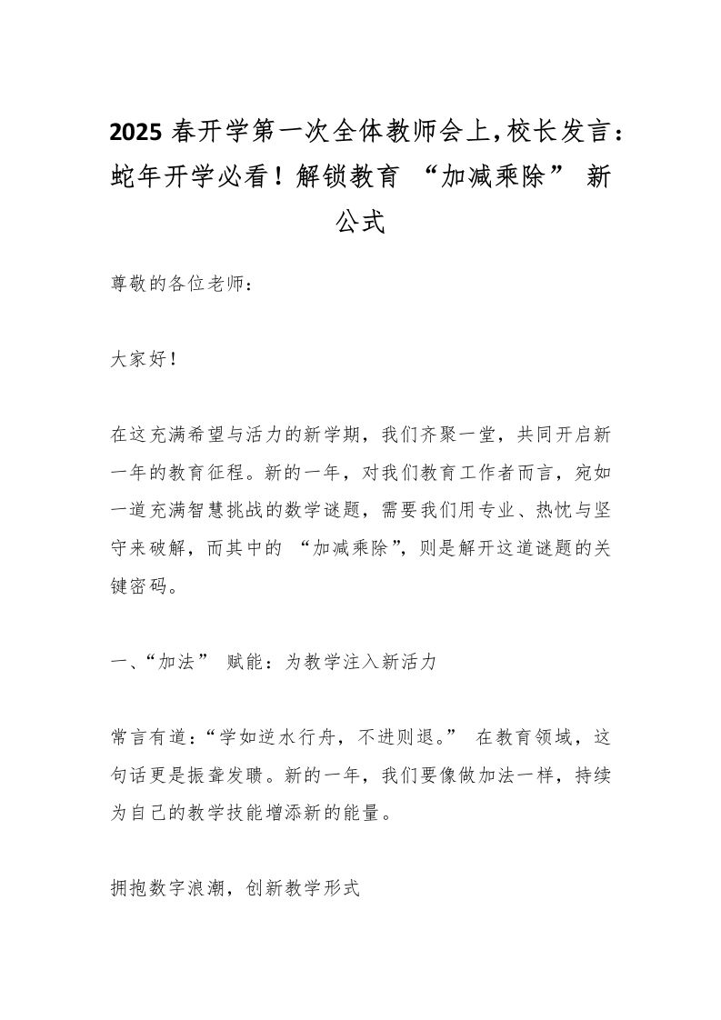 2025春开学第一次全体教师会上,校长发言:蛇年开学必看!解锁教育“加减乘除”新公式 02-12 发言稿 11 ——预览已结束,还剩5页未读——开通会员后可免费下载高清完整文档 资源下载此资源下载价格为15米,VIP免费,请先登录 资源下载下载价格15 米VIP免费请先登录 0 0