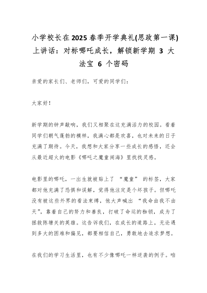 小学校长在2025春季开学典礼(思政第一课)上讲话:对标哪吒成长,解锁新学期3大法宝6个密码 02-20 发言稿 12 ——预览已结束,还剩5页未读——开通会员后可免费下载高清完整文档 资源下载此资源下载价格为15米,VIP免费,请先登录 资源下载下载价格15 米VIP免费请先登录 0 0