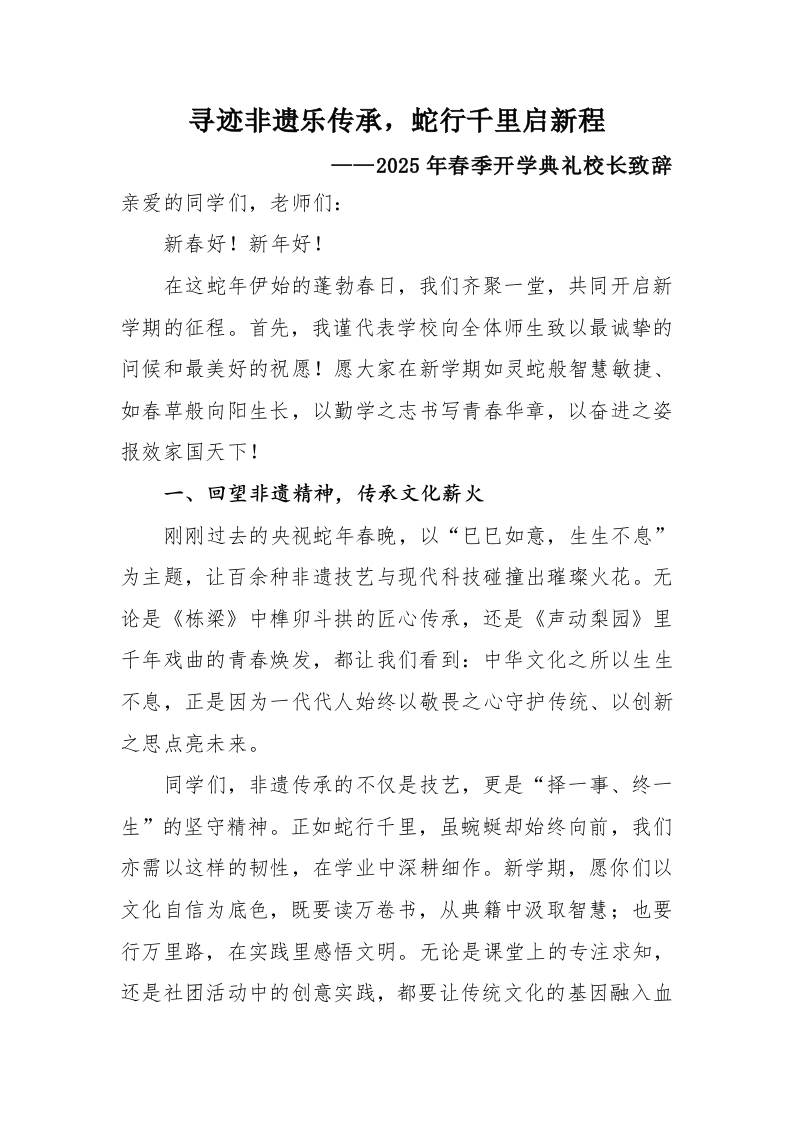 2025年春季开学典礼校长致辞-寻迹非遗乐传承,蛇行千里启新程 02-20 发言稿 11 ——预览已结束,还剩1页未读——开通会员后可免费下载高清完整文档 资源下载此资源下载价格为15米,VIP免费,请先登录 资源下载下载价格15 米VIP免费请先登录 0 0