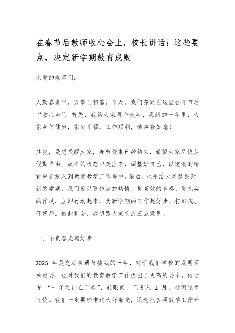 在春节后教师收心会上,校长讲话:这些要点,决定新学期教育成败 02-21 发言稿 11 ——预览已结束,还剩5页未读——开通会员后可免费下载高清完整文档 资源下载此资源下载价格为15米,VIP免费,请先登录 资源下载下载价格15 米VIP免费请先登录 0 0
