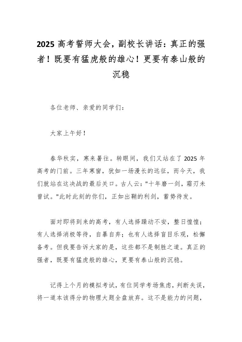2025高考誓师大会,副校长讲话:真正的强者!既要有猛虎般的雄心!更要有泰山般的沉稳 03-04 发言稿 13 ——预览已结束,还剩2页未读——开通会员后可免费下载高清完整文档 资源下载此资源下载价格为15米,VIP免费,请先登录 资源下载下载价格15 米VIP免费请先登录 0 0