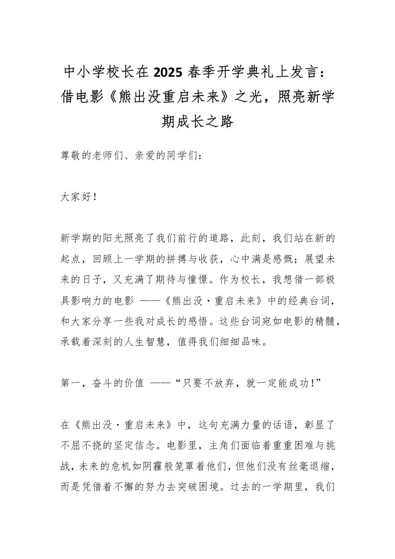 中小学校长在2025春季开学典礼上发言:借电影《熊出没重启未来》之光,照亮新学期成长之路 03-05 发言稿 11 ——预览已结束,还剩2页未读——开通会员后可免费下载高清完整文档 资源下载此资源下载价格为15米,VIP免费,请先登录 资源下载下载价格15 米VIP免费请先登录 0 0