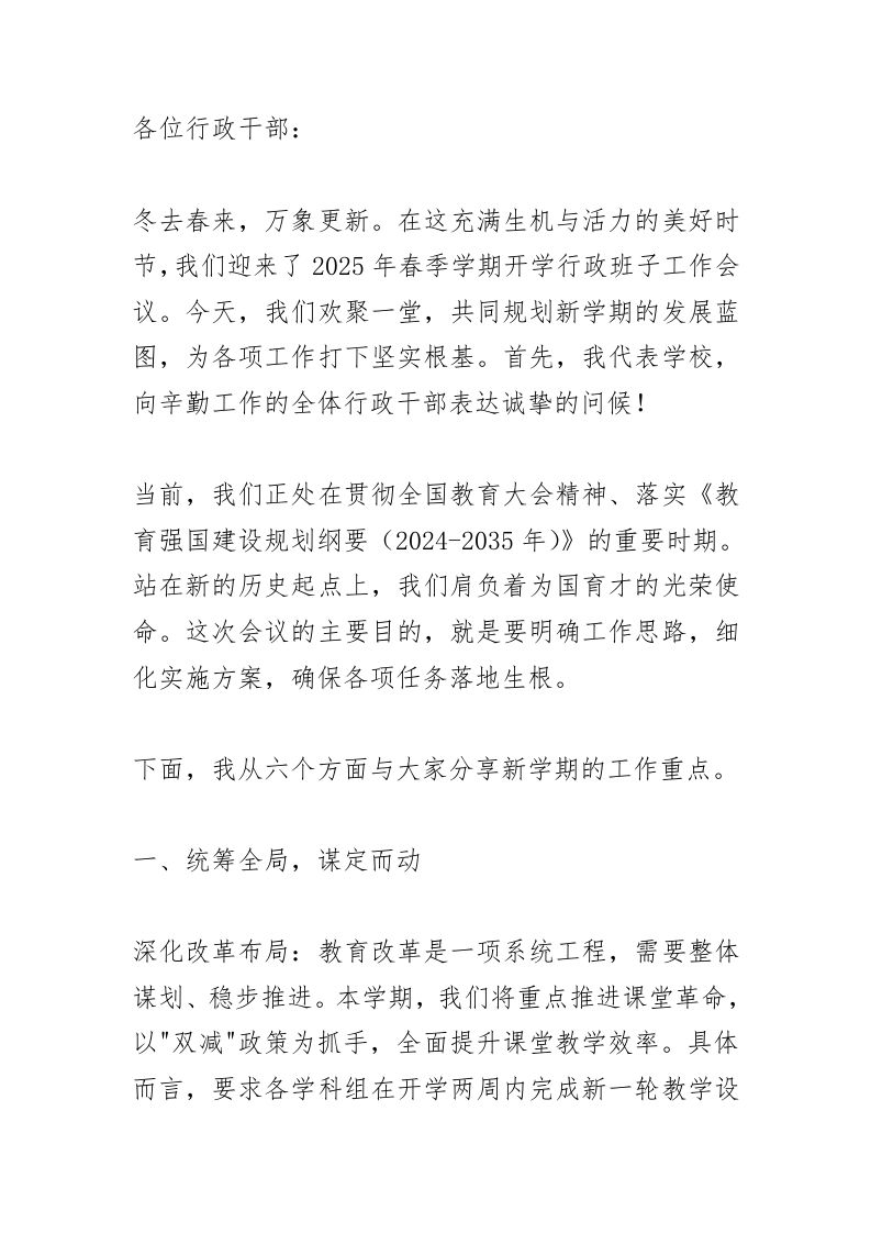 行政班子会议,校长讲话:新学期“开好局、起好步”,关键在这6点! 03-05 发言稿 11 ——预览已结束,还剩6页未读——开通会员后可免费下载高清完整文档 资源下载此资源下载价格为15米,VIP免费,请先登录 资源下载下载价格15 米VIP免费请先登录 0 0