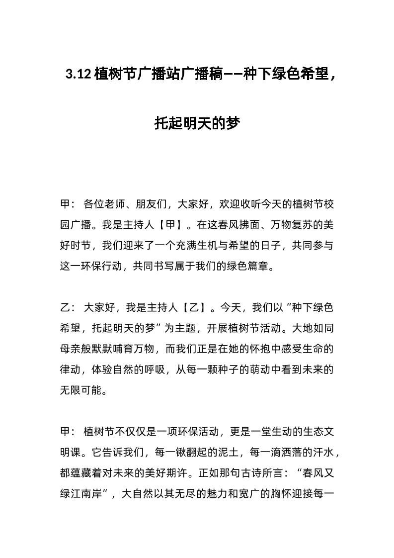 3-12植树节广播站广播稿——种下绿色希望,托起明天的梦 03-19 发言稿 11 ——预览已结束,还剩3页未读——开通会员后可免费下载高清完整文档 资源下载此资源下载价格为15米,VIP免费,请先登录 资源下载下载价格15 米VIP免费请先登录 0 0