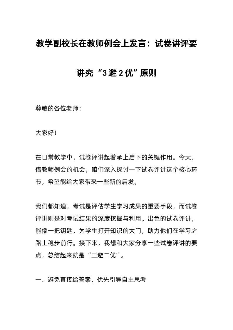 教学副校长在教师例会上发言:试卷讲评要讲究“3避2优”原则 03-26 发言稿 666 ——预览已结束,还剩3页未读——开通会员后可免费下载高清完整文档 资源下载此资源下载价格为15米,VIP免费,请先登录 资源下载下载价格15 米VIP免费请先登录 0 0