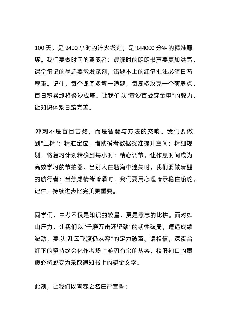 2025年中考百日誓师大会学生代表发言稿:百日冲刺燃斗志,青春无悔铸辉煌 03-27 发言稿 568 ——预览已结束,还剩1页未读——开通会员后可免费下载高清完整文档 资源下载此资源下载价格为15米,VIP免费,请先登录 资源下载下载价格15 米VIP免费请先登录 0 0