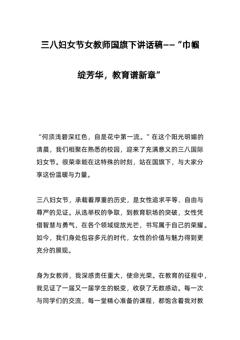 三八妇女节女教师国旗下讲话稿——“巾帼绽芳华,教育谱新章” 03-27 国旗下讲话 898 ——预览已结束,还剩1页未读——开通会员后可免费下载高清完整文档 资源下载此资源下载价格为15米,VIP免费,请先登录 资源下载下载价格15 米VIP免费请先登录 0 0