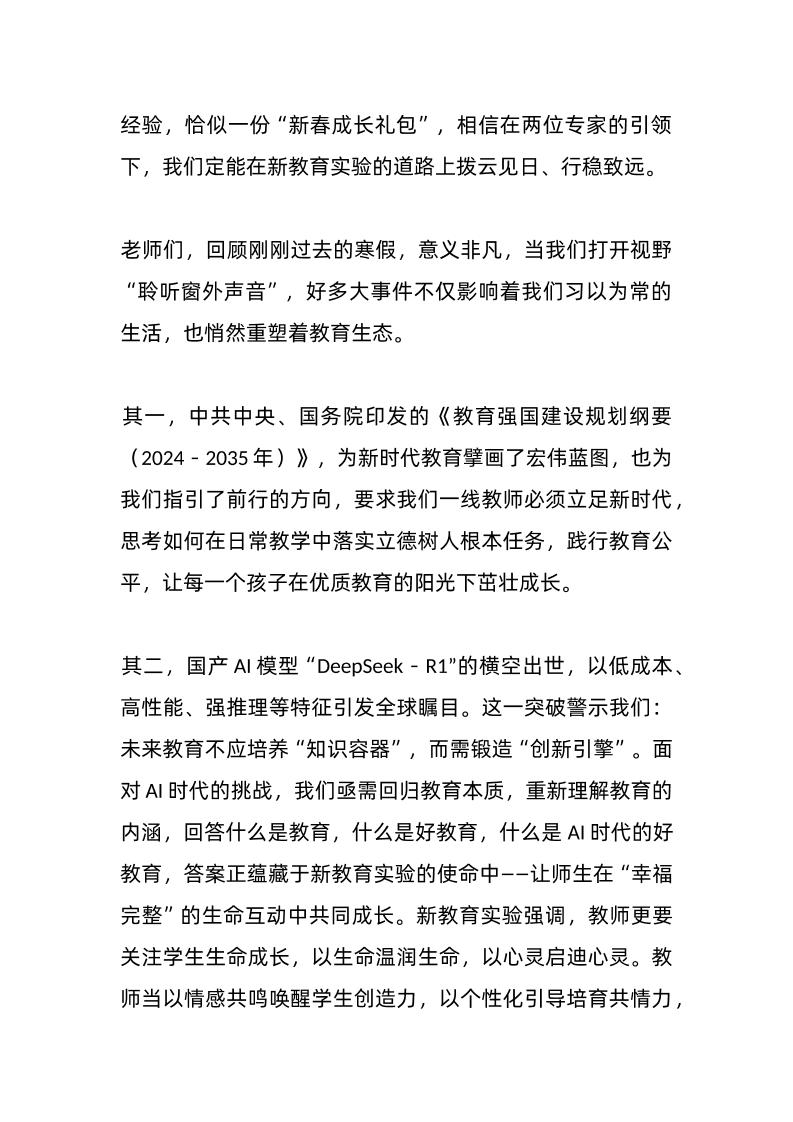 在小学教育集团2025年春季学期新教育实验专题培训启动仪式上的致辞 03-30 发言稿 982 ——预览已结束,还剩3页未读——开通会员后可免费下载高清完整文档 资源下载此资源下载价格为15米,VIP免费,请先登录 资源下载下载价格15 米VIP免费请先登录 0 0
