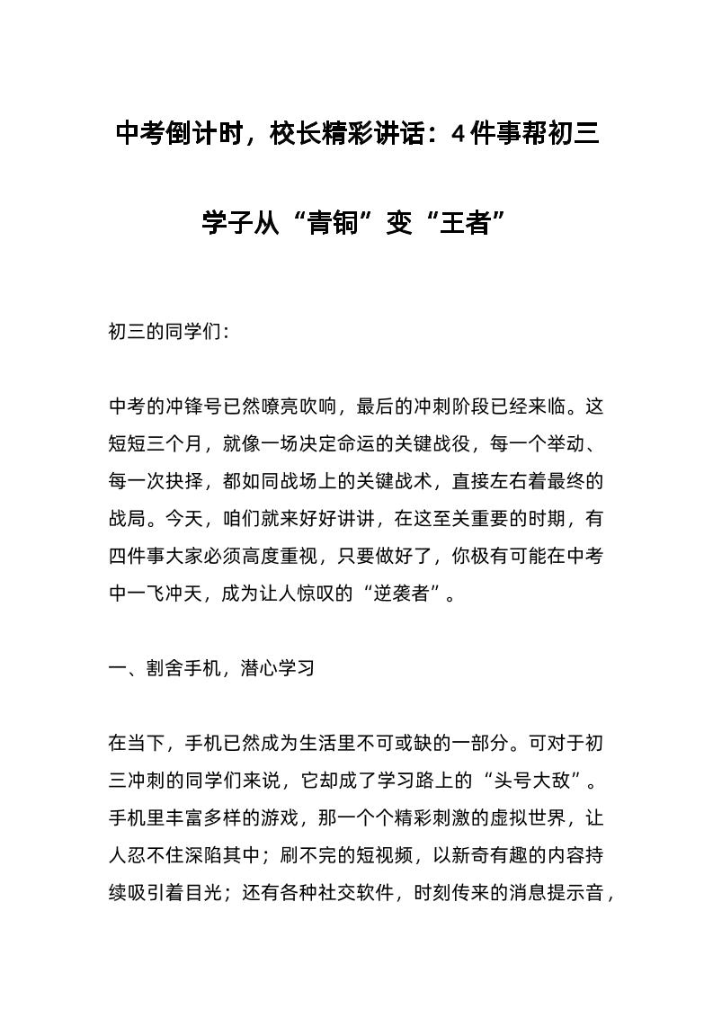中考倒计时,校长精彩讲话:4件事帮初三学子从“青铜”变“王者” 04-11 国旗下讲话 1.3k ——预览已结束,还剩3页未读——开通会员后可免费下载高清完整文档 资源下载此资源下载价格为15米,VIP免费,请先登录 资源下载下载价格15 米VIP免费请先登录 0 0