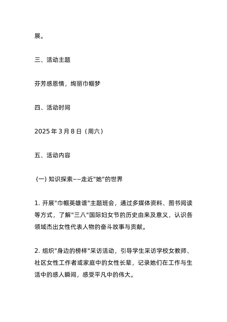 2025年小学“三八妇女节”活动方案:“芬芳感恩情,绚丽巾帼梦”! 04-12 发言稿 1.19k ——预览已结束,还剩6页未读——开通会员后可免费下载高清完整文档 资源下载此资源下载价格为15米,VIP免费,请先登录 资源下载下载价格15 米VIP免费请先登录 0 0