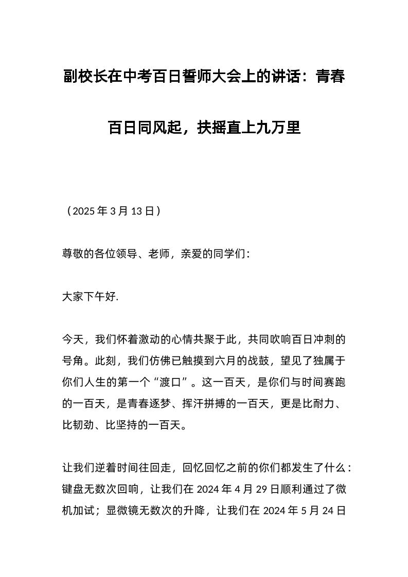 副校长在中考百日誓师大会上的讲话:青春百日同风起,扶摇直上九万里 04-15 国旗下讲话 1.3k ——预览已结束,还剩2页未读——开通会员后可免费下载高清完整文档 资源下载此资源下载价格为15米,VIP免费,请先登录 资源下载下载价格15 米VIP免费请先登录 0 0