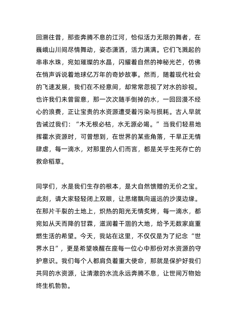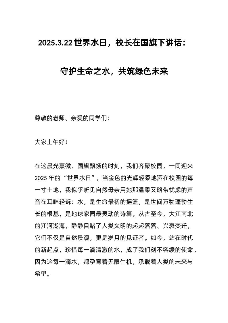 2025-3-22世界水日,校长在国旗下讲话:守护生命之水,共筑绿色未来 04-25 国旗下讲话 754 ——预览已结束,还剩3页未读——开通会员后可免费下载高清完整文档 资源下载此资源下载价格为15米,VIP免费,请先登录 资源下载下载价格15 米VIP免费请先登录 0 0