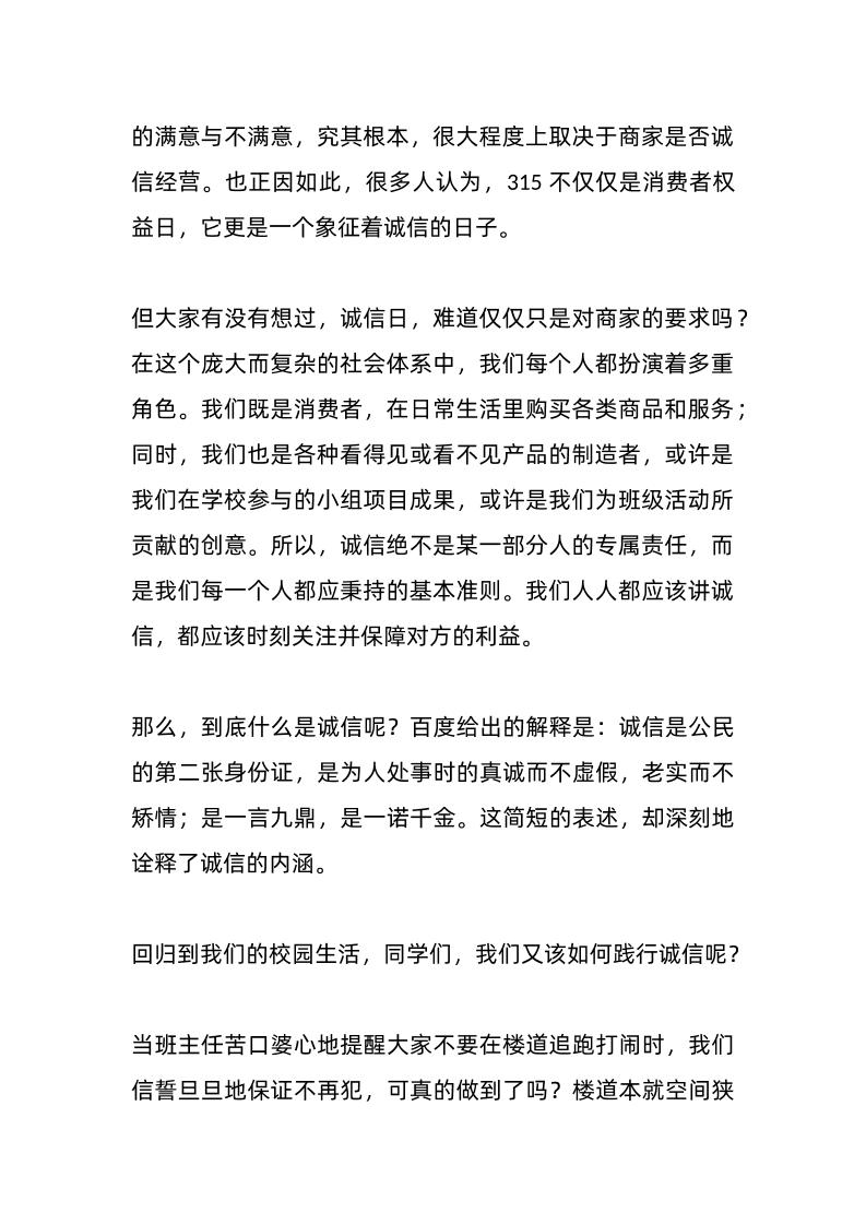 3月15日国际消费者权益日校长在国旗下讲话:校园诚信,从“小约定”做起 04-25 国旗下讲话 1.44k ——预览已结束,还剩2页未读——开通会员后可免费下载高清完整文档 资源下载此资源下载价格为15米,VIP免费,请先登录 资源下载下载价格15 米VIP免费请先登录 0 0