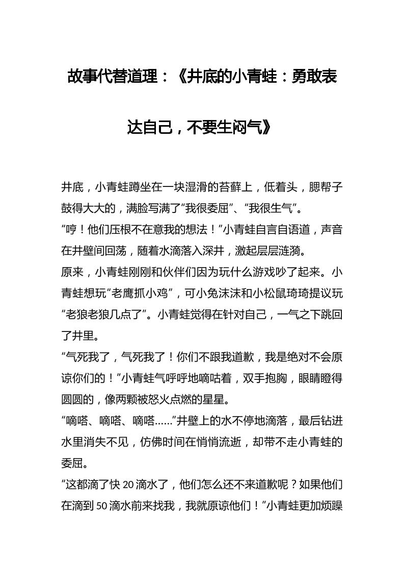 故事代替道理:《井底的小青蛙:勇敢表达自己,不要生闷气》 05-05 育人故事 1k ——预览已结束,还剩2页未读——开通会员后可免费下载高清完整文档 资源下载此资源下载价格为15米,VIP免费,请先登录 资源下载下载价格15 米VIP免费请先登录 0 0