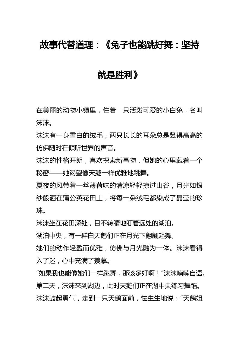 故事代替道理:《兔子也能跳好舞:坚持就是胜利》 05-05 育人故事 755 ——预览已结束,还剩4页未读——开通会员后可免费下载高清完整文档 资源下载此资源下载价格为15米,VIP免费,请先登录 资源下载下载价格15 米VIP免费请先登录 0 0