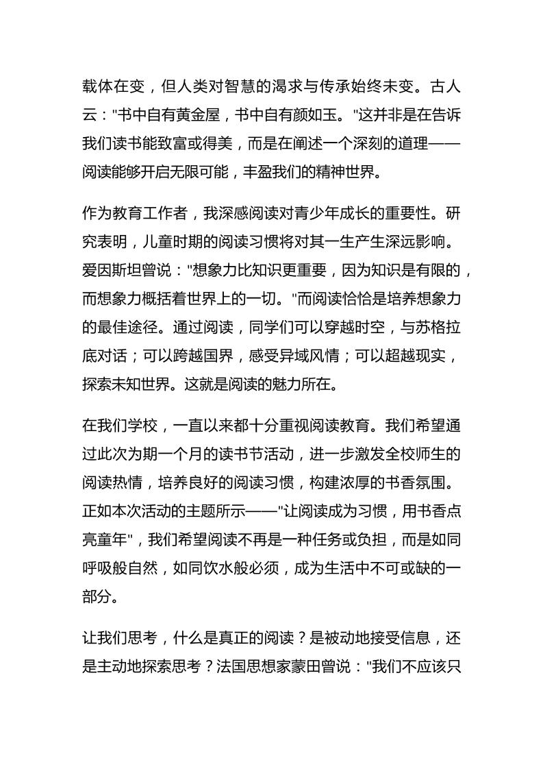 校园读书节启动仪式校长讲话稿:让阅读成为习惯,用书香点亮童年 05-09 发言稿 669 ——预览已结束,还剩3页未读——开通会员后可免费下载高清完整文档 资源下载此资源下载价格为15米,VIP免费,请先登录 资源下载下载价格15 米VIP免费请先登录 0 0