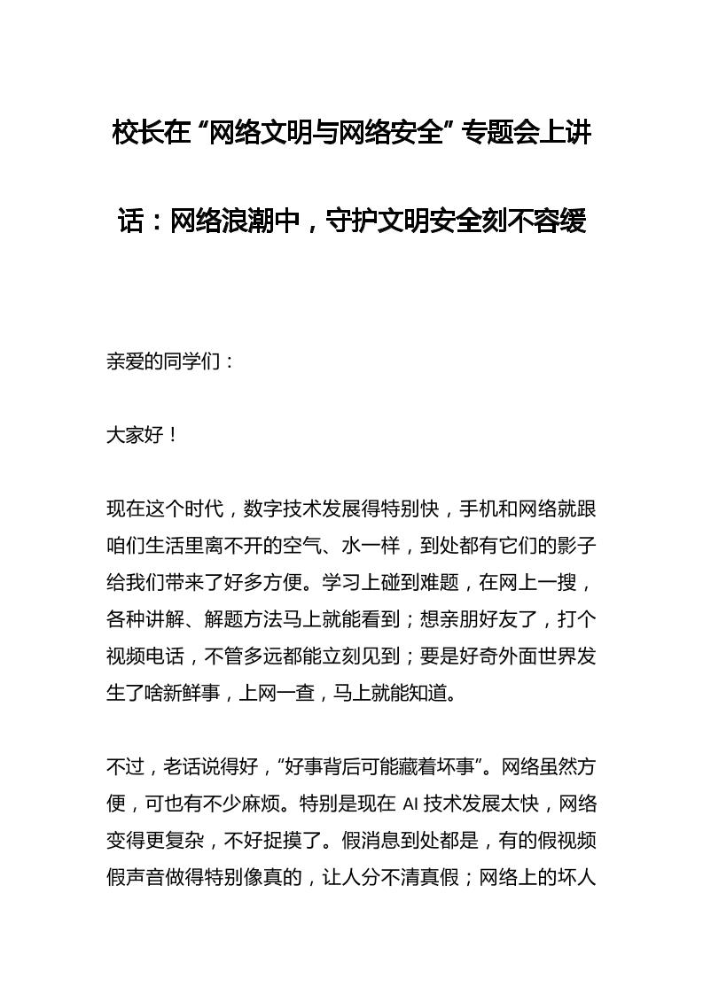 校长在“网络文明与网络安全”专题会上讲话:网络浪潮中,守护文明安全刻不容缓 05-09 发言稿 579 ——预览已结束,还剩4页未读——开通会员后可免费下载高清完整文档 资源下载此资源下载价格为15米,VIP免费,请先登录 资源下载下载价格15 米VIP免费请先登录 0 0