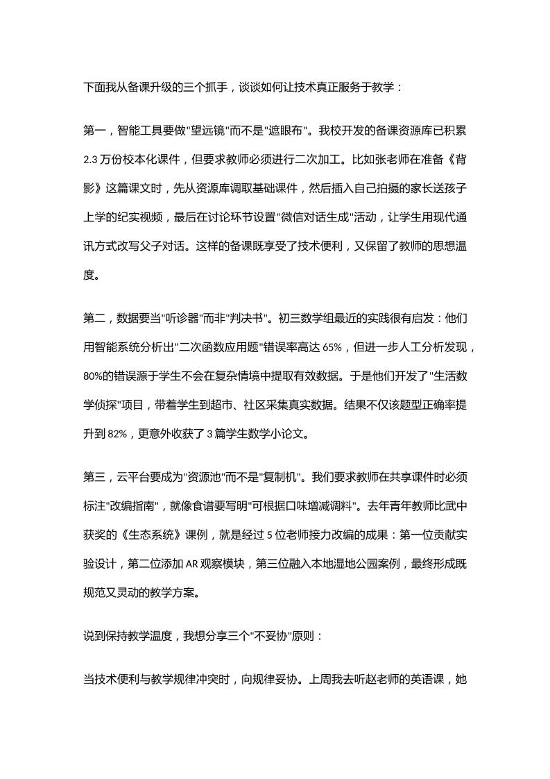校长在教育教学研讨会上讲话:信息化2.0时代的教育坚守——技术赋能下的备课升级与教学温度保持 05-09 发言稿 1.34k ——预览已结束,还剩2页未读——开通会员后可免费下载高清完整文档 资源下载此资源下载价格为15米,VIP免费,请先登录 资源下载下载价格15 米VIP免费请先登录 0 0