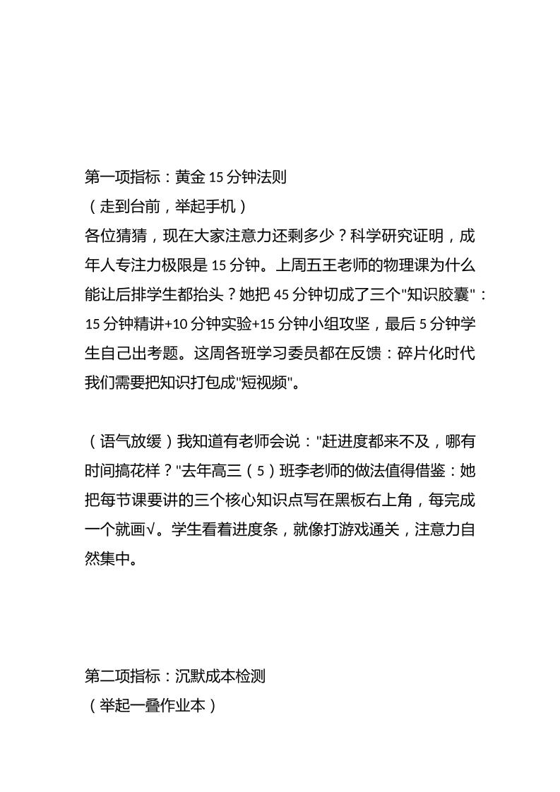 校长在全体教师大会上的讲话:高效课堂必备的6项硬指标! 05-10 发言稿 1.12k ——预览已结束,还剩5页未读——开通会员后可免费下载高清完整文档 资源下载此资源下载价格为15米,VIP免费,请先登录 资源下载下载价格15 米VIP免费请先登录 0 0