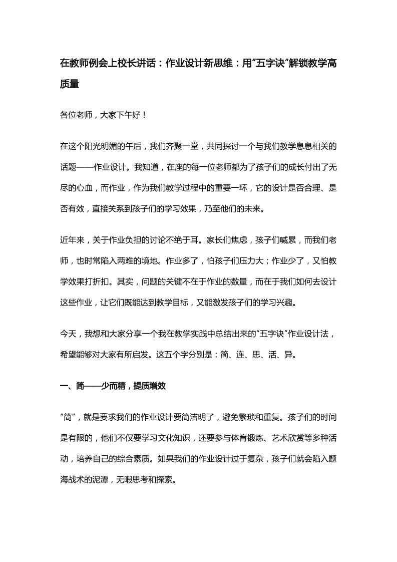 在教师例会上校长讲话:作业设计新思维:用“五字诀”解锁教学高质量 05-11 发言稿 1.43k ——预览已结束,还剩3页未读——开通会员后可免费下载高清完整文档 资源下载此资源下载价格为15米,VIP免费,请先登录 资源下载下载价格15 米VIP免费请先登录 0 0